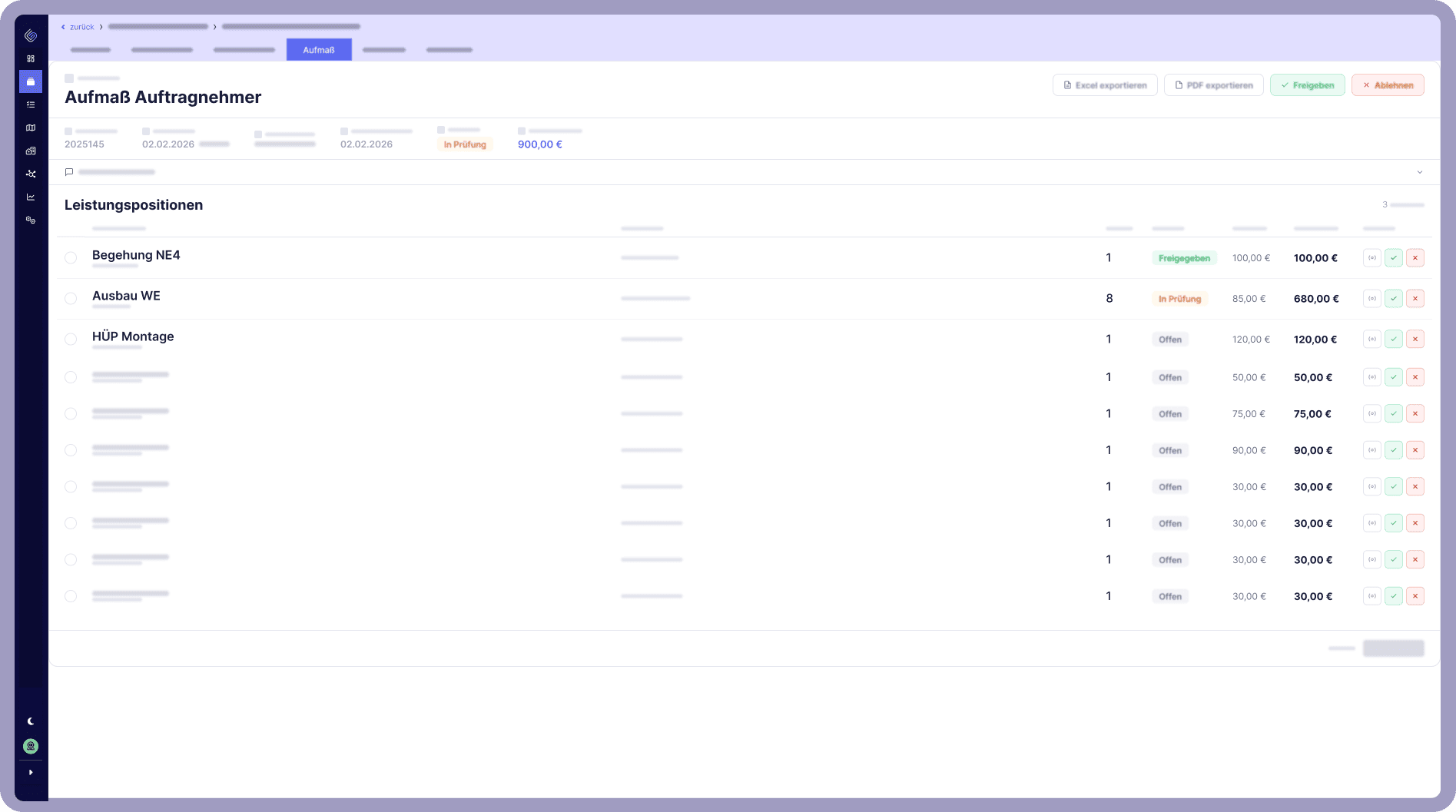 Wer mehrere Nachauftragnehmer mit unterschiedlichen Preisvereinbarungen koordiniert, braucht eine Abrechnung, die das abbilden kann. Gridbit trennt Aufmaße sauber nach Auftraggeber und Nachauftragnehmer – und macht jeden Schritt von der Rückmeldung bis zur Freigabe nachvollziehbar.